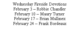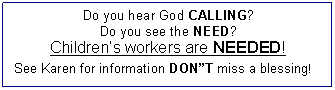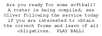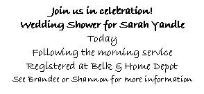 * If you are not currently receiving calendars by mail or email reminders of our events and would like to, please give your home address and/or email address to Debbie or Pastor Myron Yandle. You can also write the info on the tear-off bulletin tab and drop it in the offering plate.